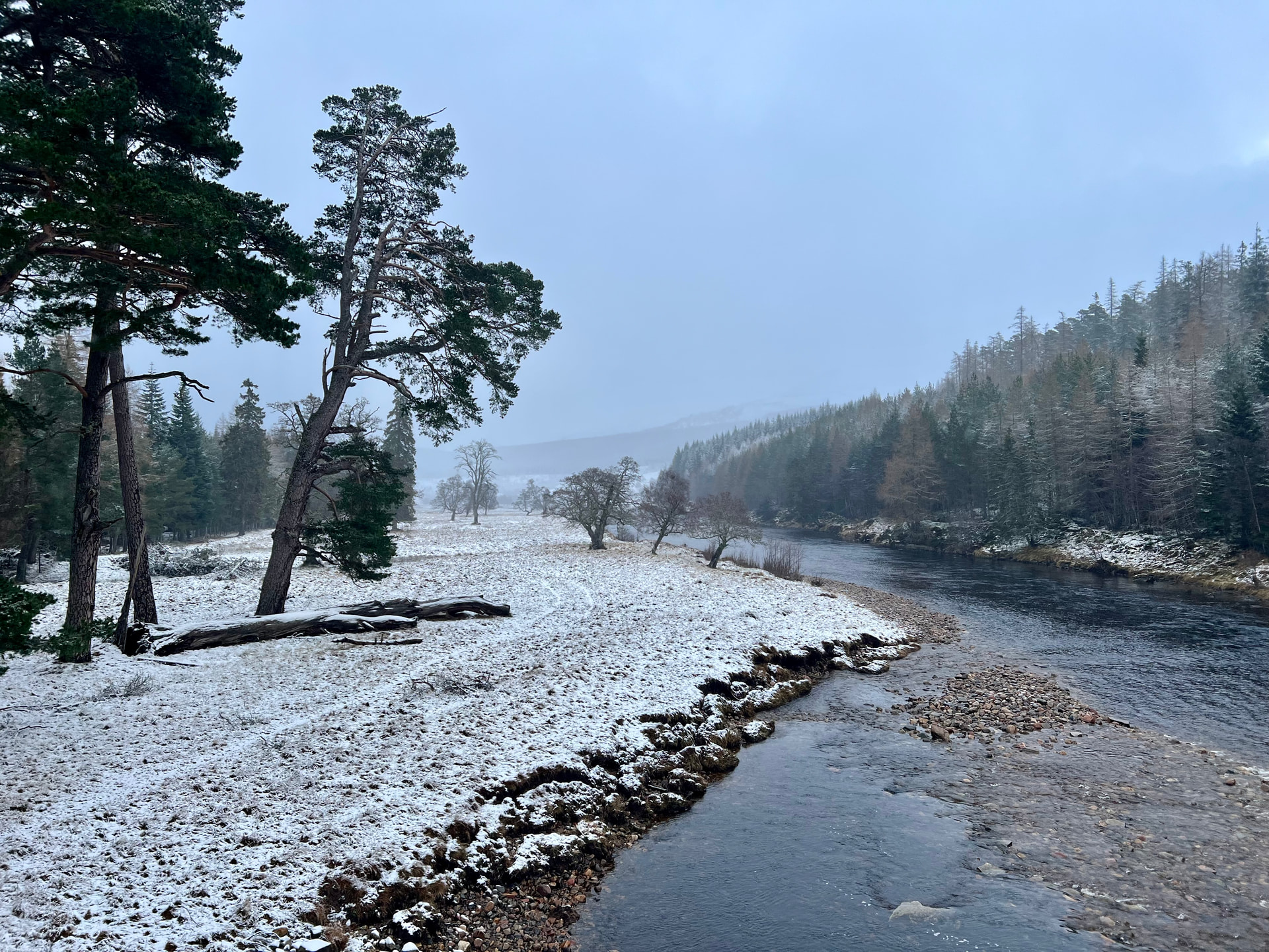 School run at 9am and then I was off to Braemar. It was rain until it turned to snow at Ballater, although had stopped by the time I parked up opposite Victoria Bridge. My later start meant the others were on or nearly on their summits and I chased Fraser whilst walking up to Mar Lodge estate.