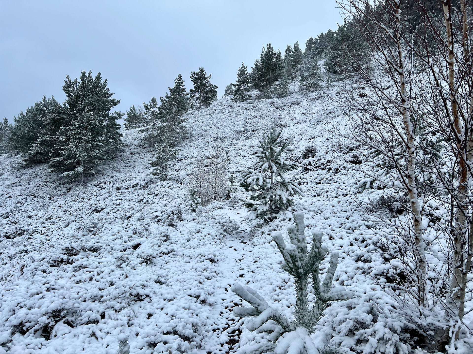 Sheltered by the hill and trees, it was a pleasant walk up the Land Rover track, some new snow on the ground but straightforward. Once off this and heading up the hill to the summit was harder work. Could’ve done with some snow shoes as the snow wasn’t frozen enough to walk on with spikes.